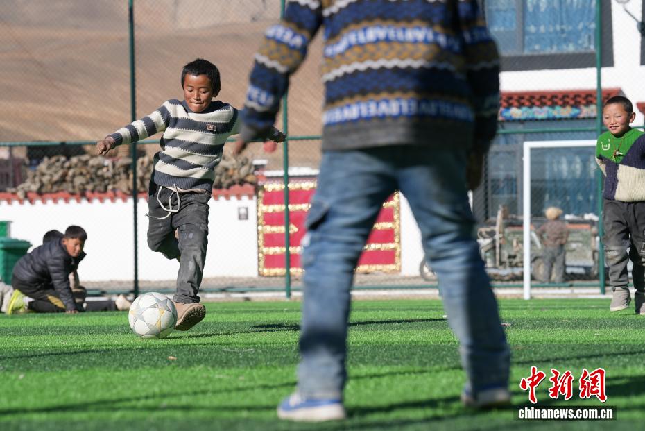 2025年1月7日,西藏定日发生6.8级地震,时隔近一年,12月24日,中新社记者探访灾后重建。日喀则森嘎村的藏式新房错落有致,柏油路连通家家户户,屋顶太阳能热水器整齐排列,炊烟袅袅间满是生机。据悉,此次日喀则地震灾后重建覆盖7县47乡镇486村,2.2万余户重建民房、1.05万余户维修加固民房已全部竣工交付,受灾民众喜迁新居。图为森嘎村的孩子们在踢足球。中新社记者 贡嘎来松 摄