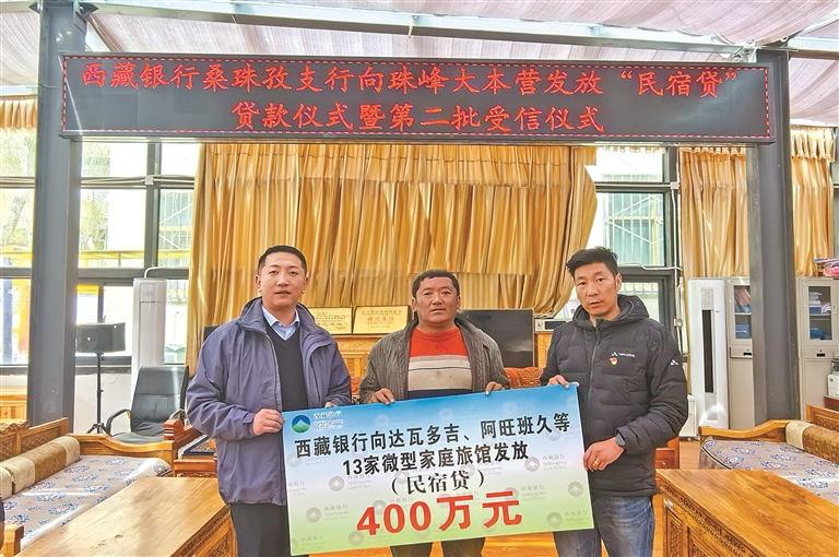 图为西藏银行向珠峰大本营13家微型家庭旅馆发放“民宿贷”贷款。