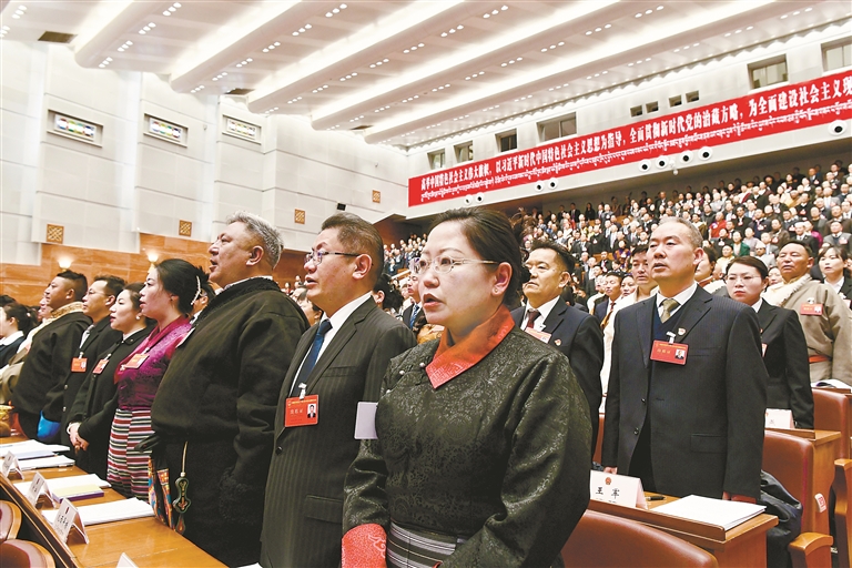 人大代表们神情庄重,齐声高唱国歌。记者 旦增兰泽 摄