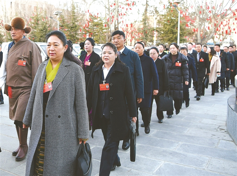 人大代表们精神饱满、意气风发地步入会场。记者 洛桑 摄