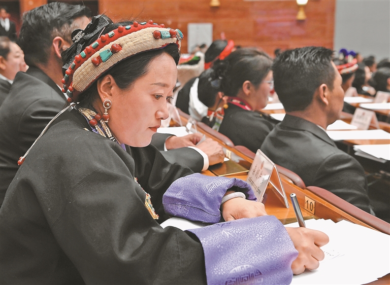 人大代表们在认真听会。记者 洛桑 摄