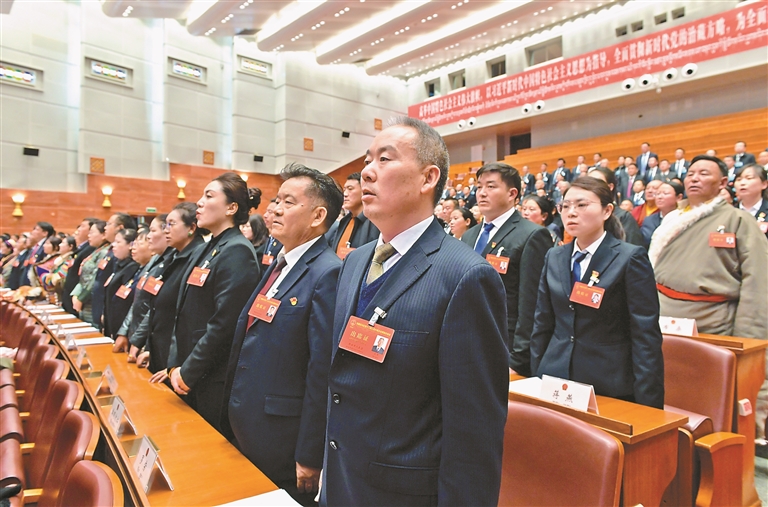 人大代表们神情庄重、齐声高唱国歌。记者 丹增群培 摄