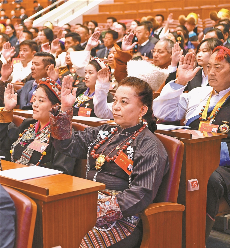 人大代表们举手表决各项决议草案。记者 洛桑 摄