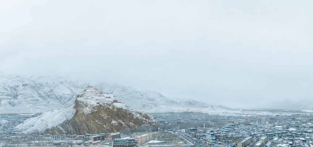3月13日,空中俯瞰雪后的西藏日喀则市江孜县江孜宗山古堡。