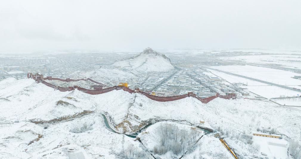 3月13日,一场春雪让西藏日喀则市江孜县全国重点文物保护单位江孜宗山古堡银装素裹,与雪域高原田园风光相映成景。