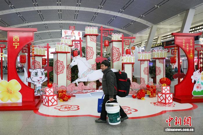 2月2日,2026年中国春运首日,旅客从西宁火车站装扮的马年氛围装饰区前走过。马铭言 摄