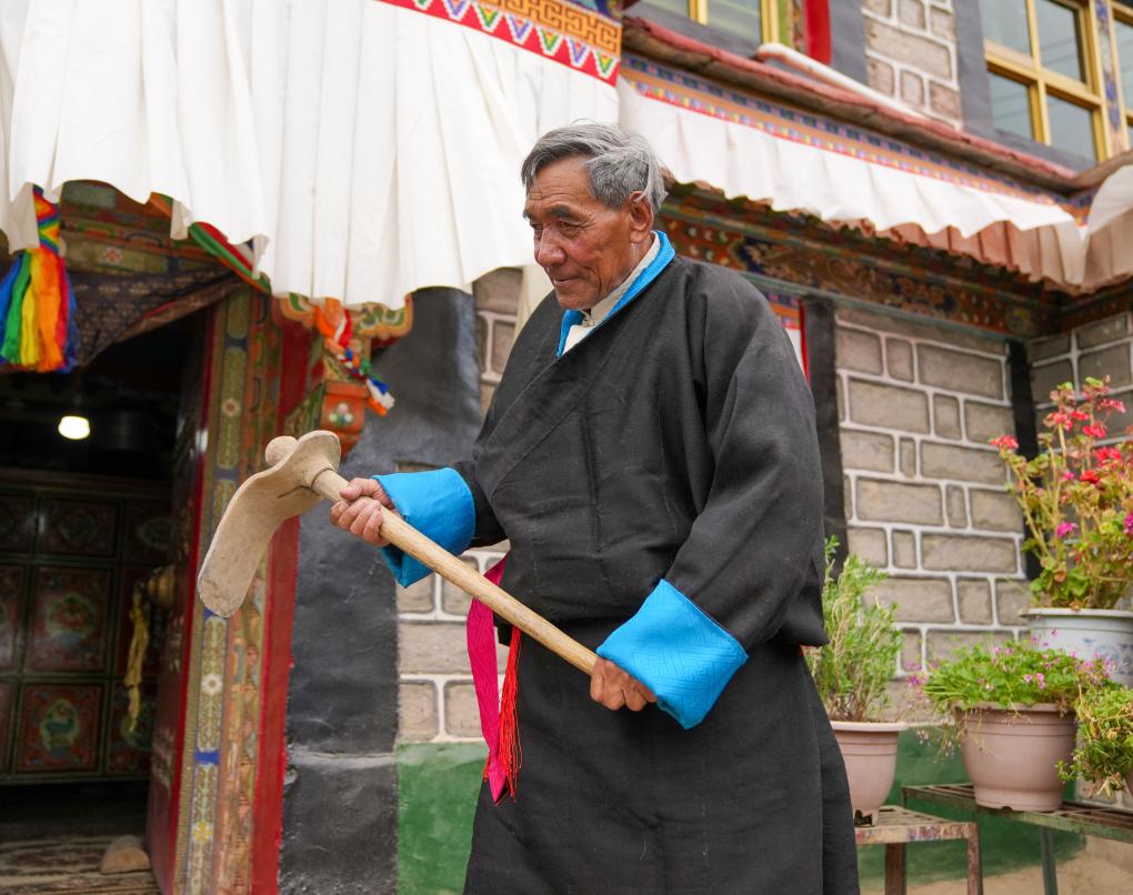 达瓦片多展示当农奴时使用过的农具(3月12日摄)。