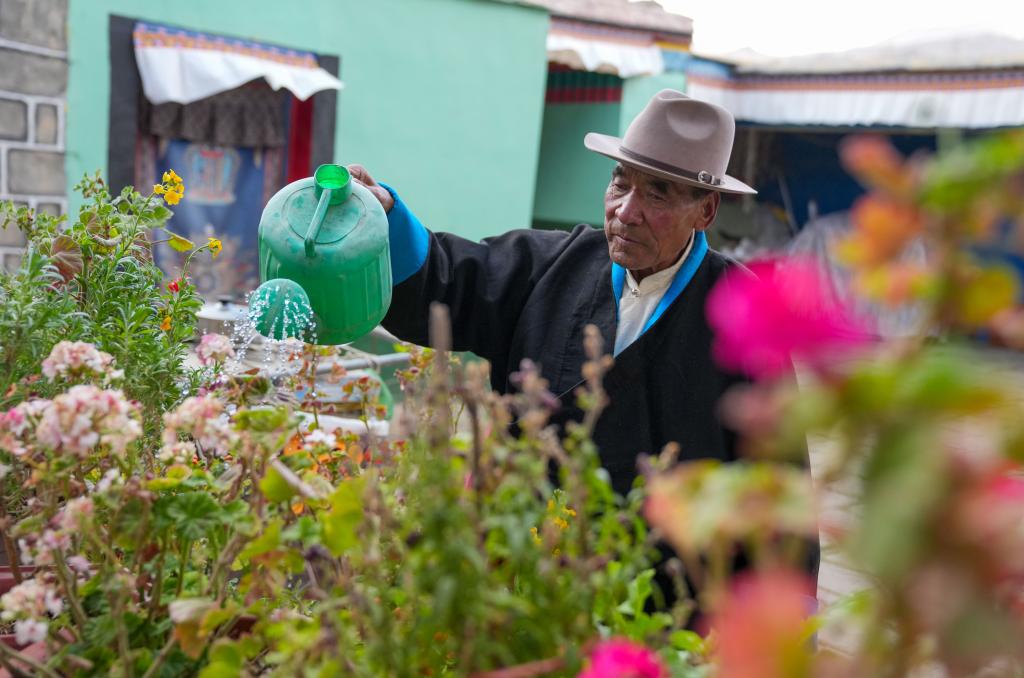 达瓦片多在院子里给花浇水(3月12日摄)。
