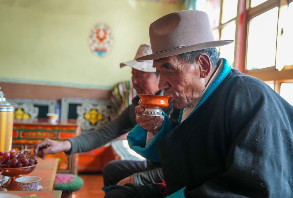 达瓦片多在家中喝酥油茶(3月12日摄)。