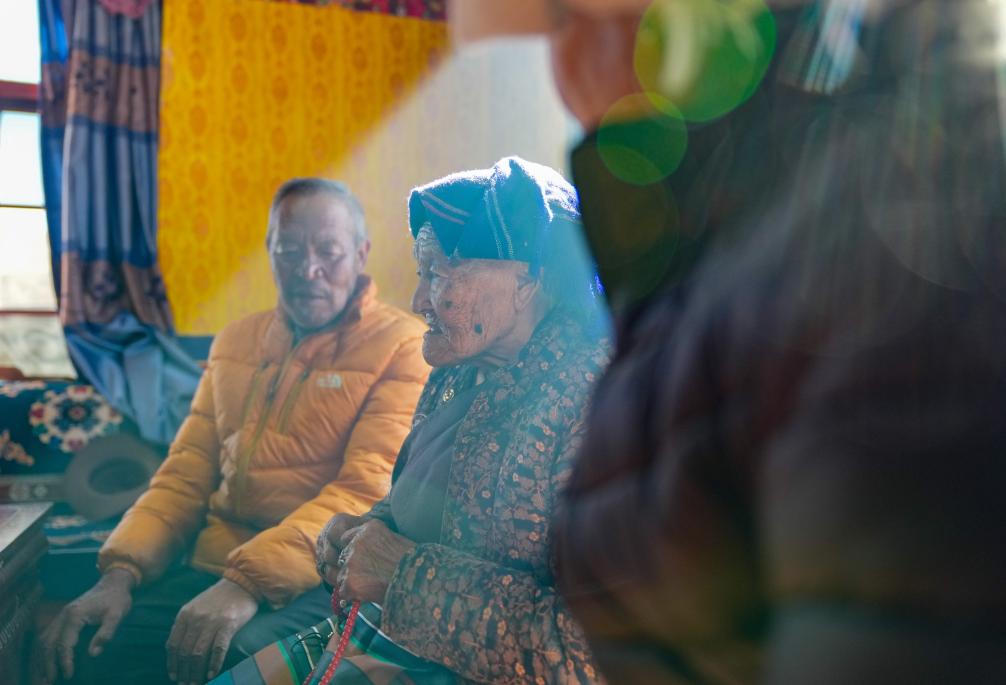 贡觉曲珍(右)在家中和儿子聊天(3月6日摄)。