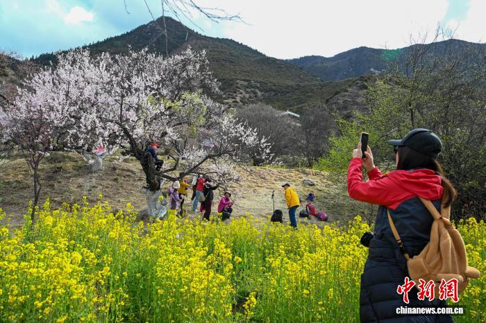 4月3日,游客在西藏林芝市嘎拉村拍照留念。中新社记者 贡嘎来松 摄