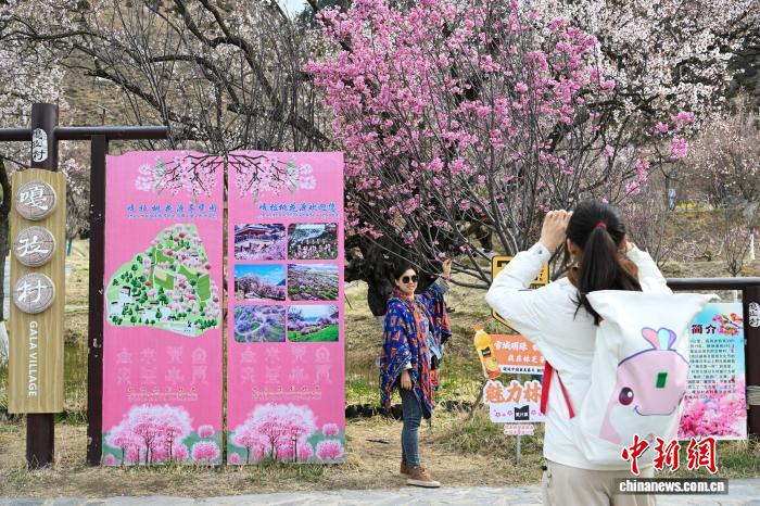 4月3日,游客在嘎拉村拍照留念。西藏林芝市嘎拉村被誉为“林芝桃花第一村”,是林芝市最佳的赏花地之一。中新社记者 贡嘎来松 摄