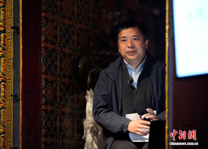 图为藏戏研究专家、西藏自治区艺术研究所副研究员桑吉东智博士为观众梳理藏戏发展的历史坐标与艺术特征。李林摄