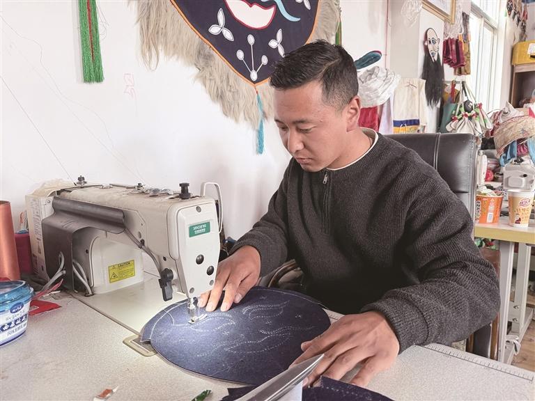 或许是在家族氛围的熏陶下,米玛坚才虽对藏戏面具心存敬畏,但对针线活格外感兴趣。小学一年级时,他的第一部“作品”应运而生。捡来父亲和爷爷不要的边角料,自己摸索着缝小口袋。那种亲手做成一件小东西的踏实感,像一颗种子,悄悄落在了他的心底,慢慢生根发芽。
