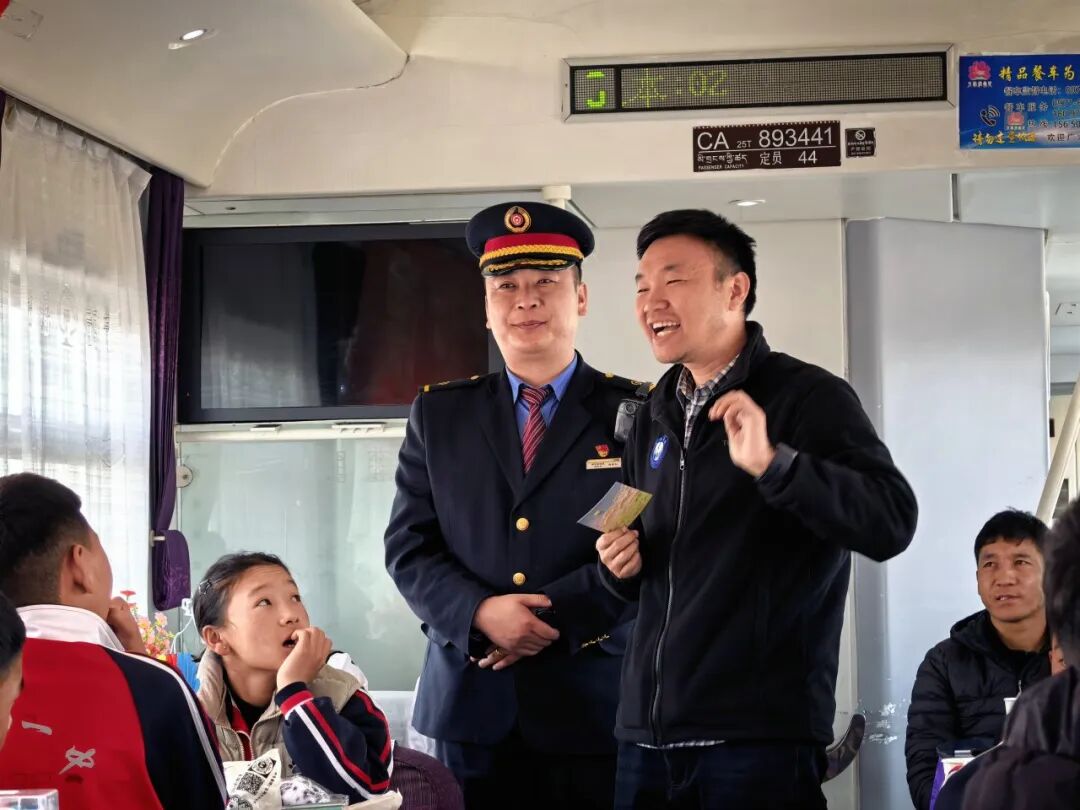 当日上午9时,列车从格尔木站平稳发车。定日县教育局上海援藏干部组织全体研学师生齐聚车厢,青海省民族团结进步先进个人、新时代铁路榜样阿忠仁列车长走上讲台。