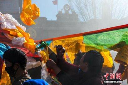 2018年2月6日,西藏拉萨大昭寺前桑烟袅袅,悠长的法号和唢呐声从金顶传来,各地信众、游客争睹大昭寺周边五根经幡柱一年一度更换新经幡。[详细]