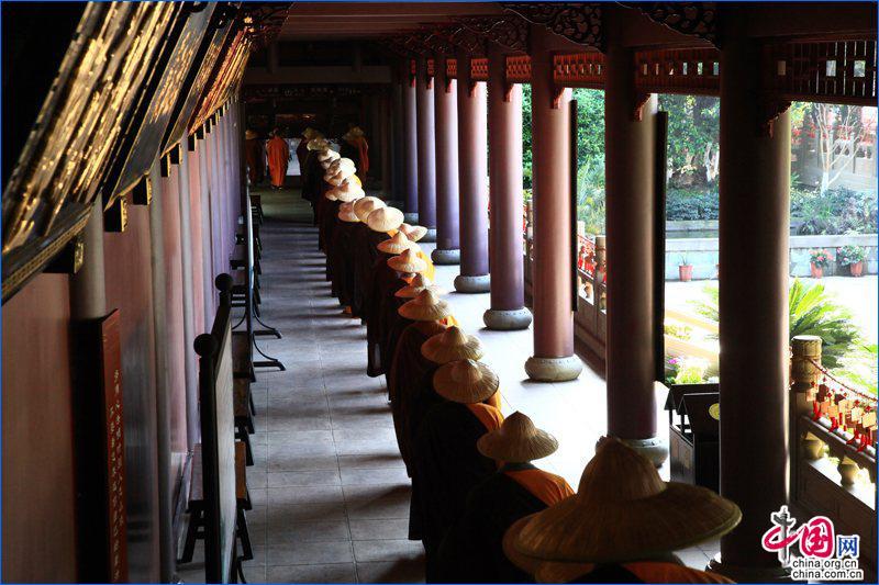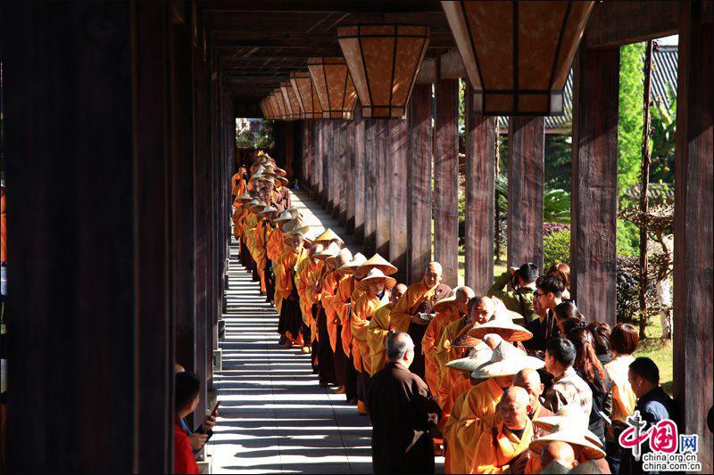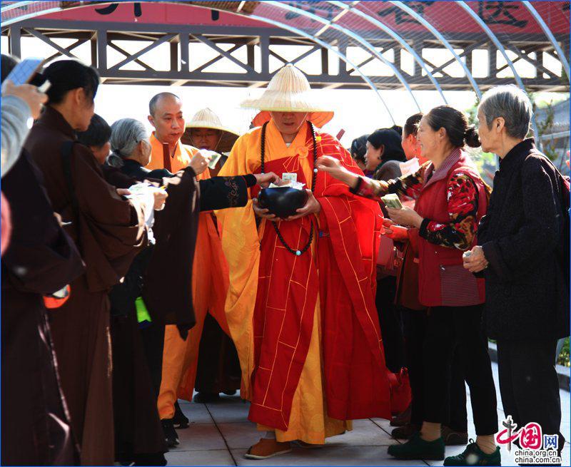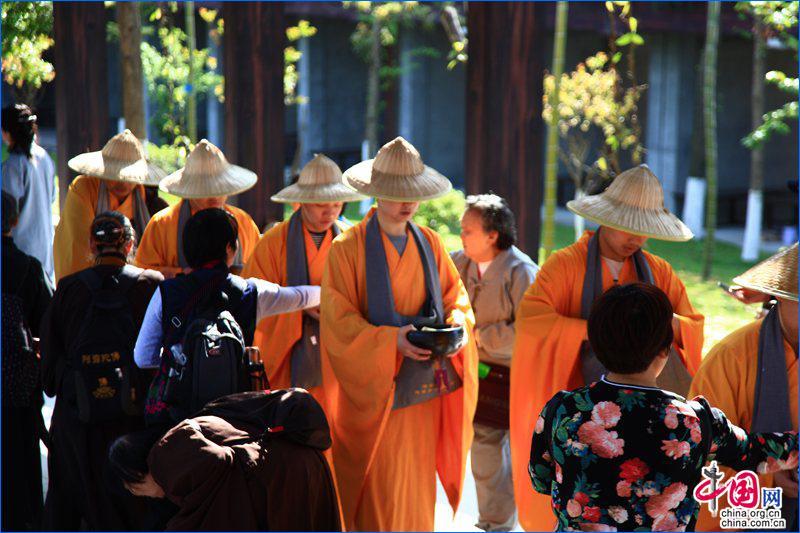 四众弟子共同参加此次法会,峨眉山释永寿大和尚率千僧走出了大佛禅院朝拜区,僧人们穿着纳衣,头戴斗笠,手托食钵,脚踏芒鞋。居士信众游人以一颗虔诚之心恭立于行脚路的沿途,纷纷向僧侣手中的钵盂投放着善款和各种供品。场面庄严清净、动人心弦、蔚为壮观。