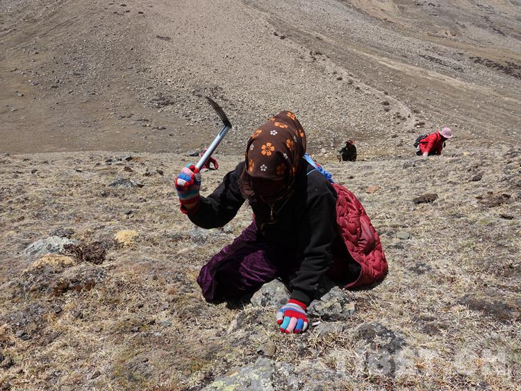 图为村民们爬到5000多米高的山上,四肢着地寻找虫草。