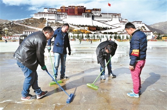 11月14日,记者在布达拉宫广场看到,数名工作人员挥动长柄刷,对广场地面上的污渍、斑痕进行刷洗,并调来洒水车,向地面喷洒清水。[详细] -