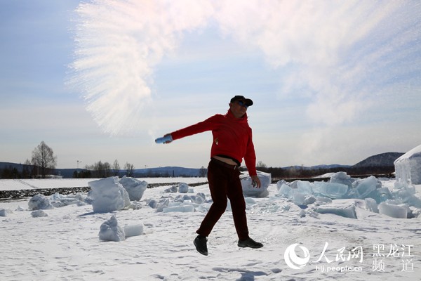 南方游客在大兴安岭呼中体验“泼水成冰”。