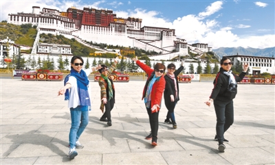 图为游客在布达拉宫广场拍照留念。唐斌 摄