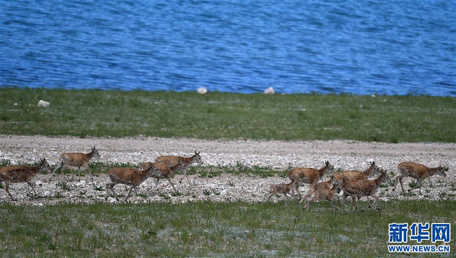 7月19日,藏羚羊群在错鄂湖旁行进。 新华社记者 觉果 摄