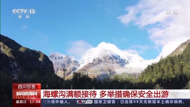 节日期间的海螺沟景区晴空万里,海拔6410米的贡嘎山金银峰,在蓝天白云映衬下更显巍峨壮丽。