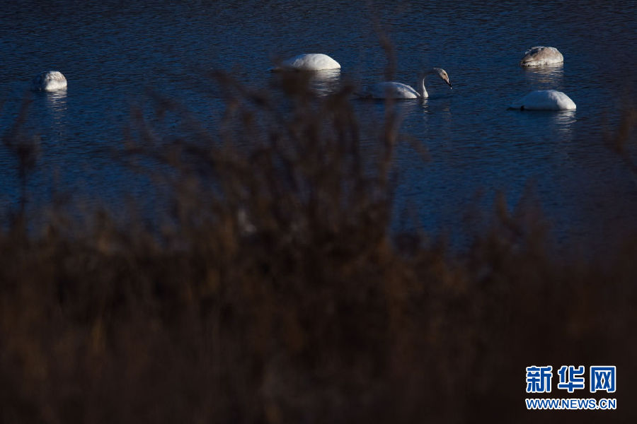 12月11日,几只大天鹅在青海省贵德县境内的黄河里游弋。新华社记者 吴刚 摄