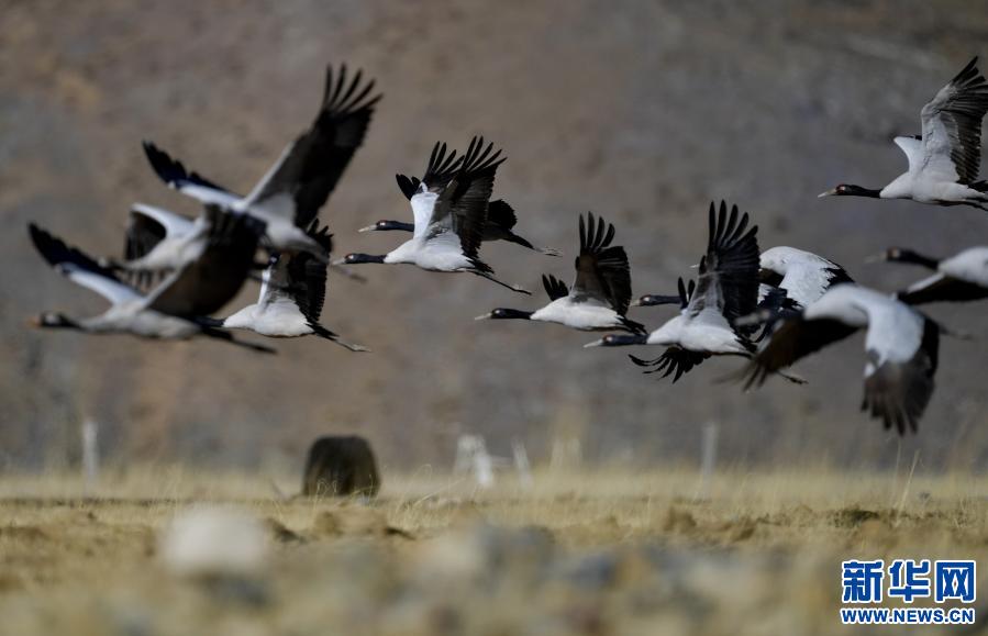 冬日,大批黑颈鹤在西藏拉萨市林周县境内栖息、觅食。 林周县黑颈鹤自然保护区建立于1993年,2003年被设立为国家级自然保护区,是雅鲁藏布江中游自然保护区的核心部分,在每年的11月底至12月初,这里便会迎来成群的黑颈鹤过冬。