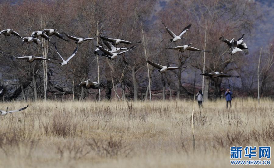 冬季,成群结队的黑颈鹤迁徙到西藏林芝市,雅鲁藏布江及江畔的农田成了它们越冬的乐园。