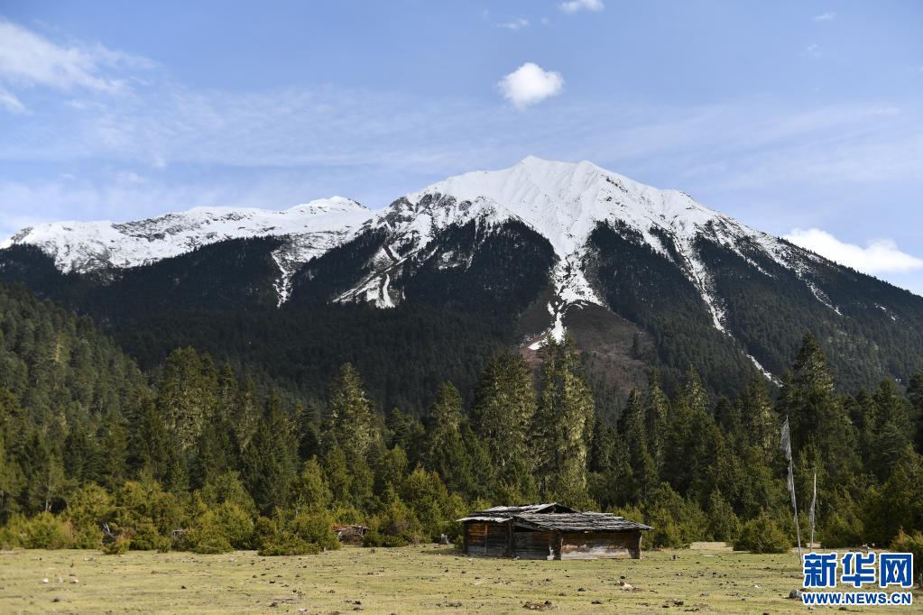 这是5月1日在西藏林芝市工布江达县拍摄的新措旁桑通牧场上的木屋。新华社记者 孙瑞博 摄