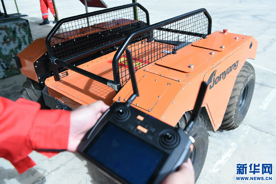 8月5日,工作人员在拉萨基地演示遥控水陆两栖随行机器人。新华网 旦增努布 摄