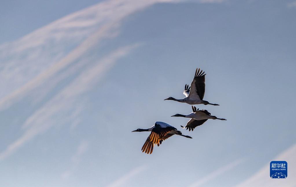 黑颈鹤在林周县强嘎乡上空飞翔(11月6日摄)。新华社记者 周荻潇 摄