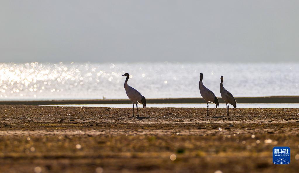 在林周县虎头山水库拍摄的黑颈鹤(11月6日摄)。新华社记者 姜帆 摄