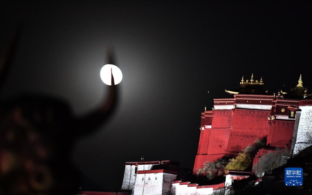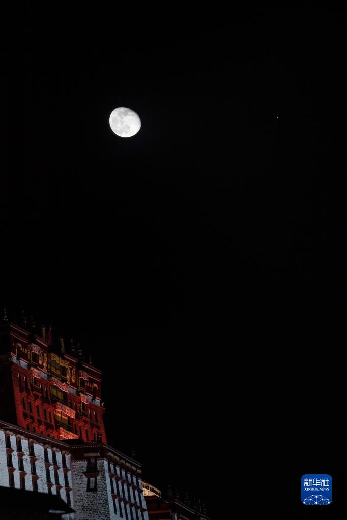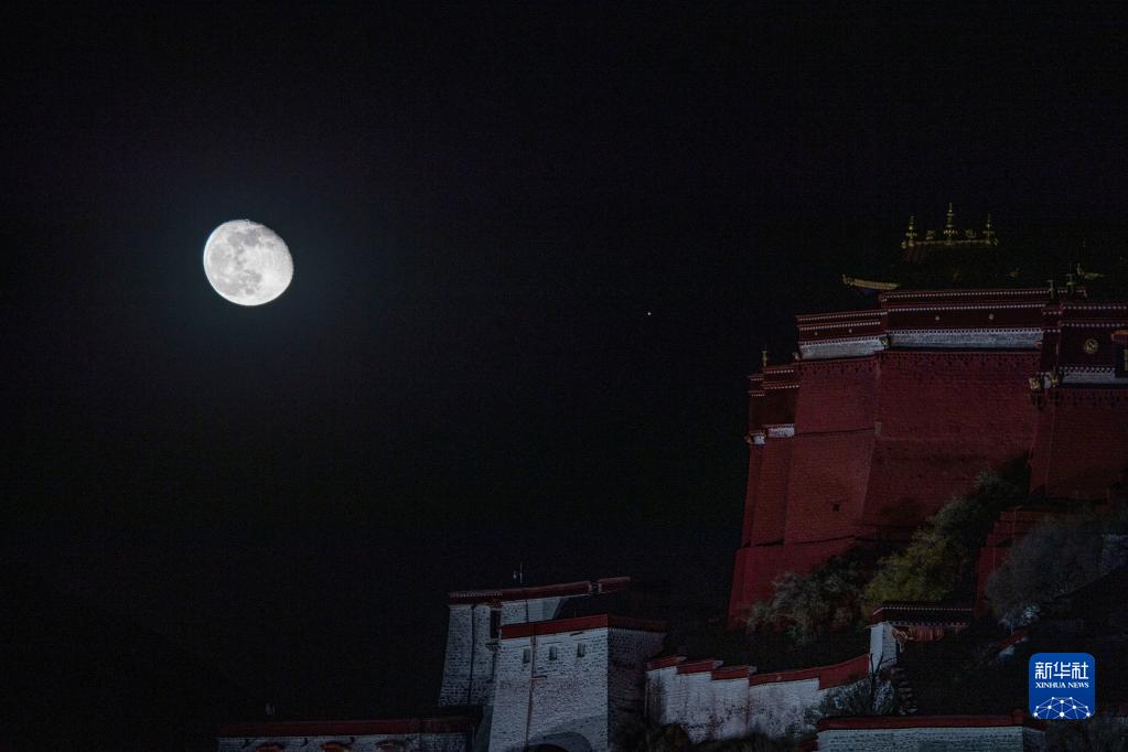 11月11日晚,一次赏心悦目的火星合月亮相天宇。这是在西藏拉萨市布达拉宫附近,记录下的这幕“星月童话”。新华社记者 觉果 摄