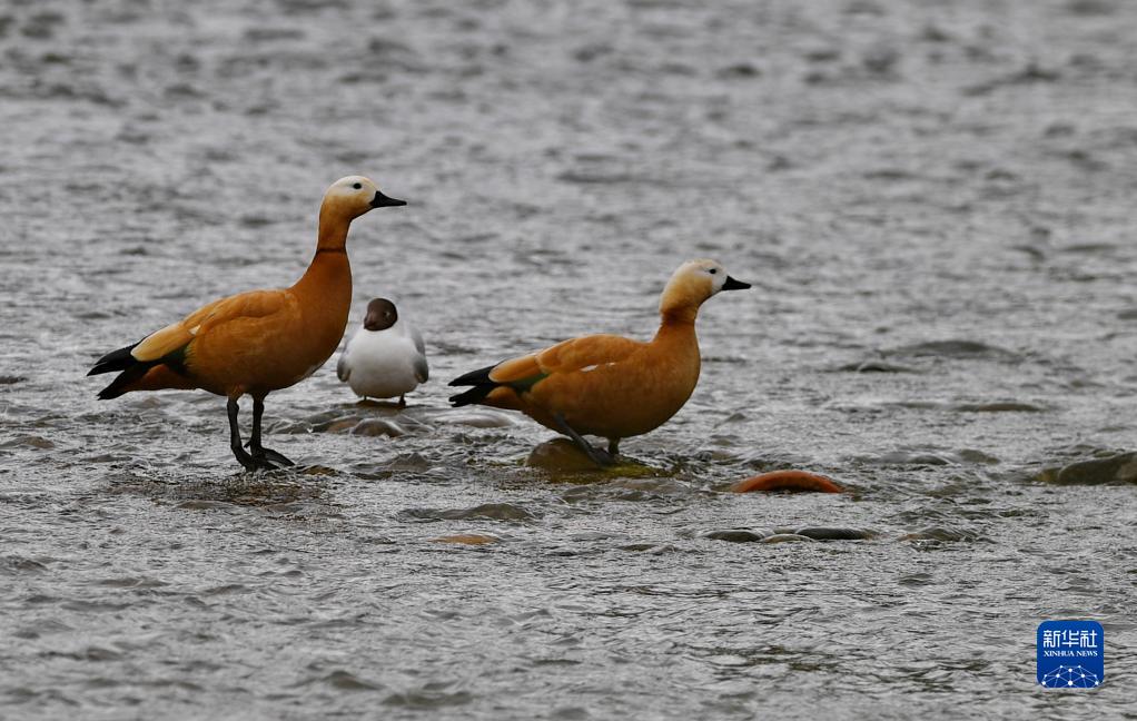 拉萨河上的赤麻鸭和棕头鸥(4月16日摄)。新华社记者 张汝锋 摄