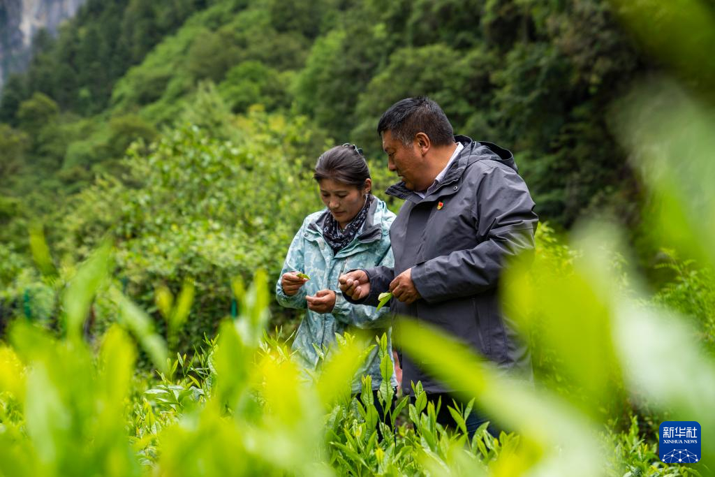 在勒门巴民族乡的一处茶田,格桑旦增和女儿次仁旺姆正在查看茶叶生长情况(2023年6月27日摄)。新华社记者 孙非 摄