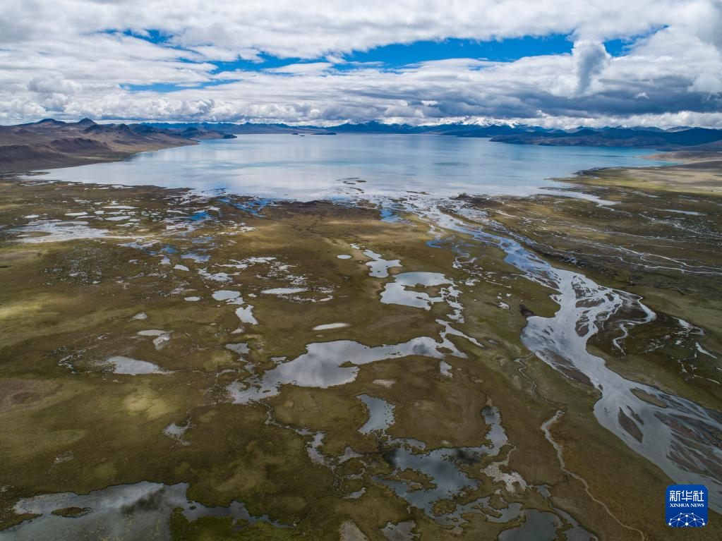 这是7月4日拍摄的普莫雍错湖边的湿地(无人机照片)。新华社记者 孙非 摄