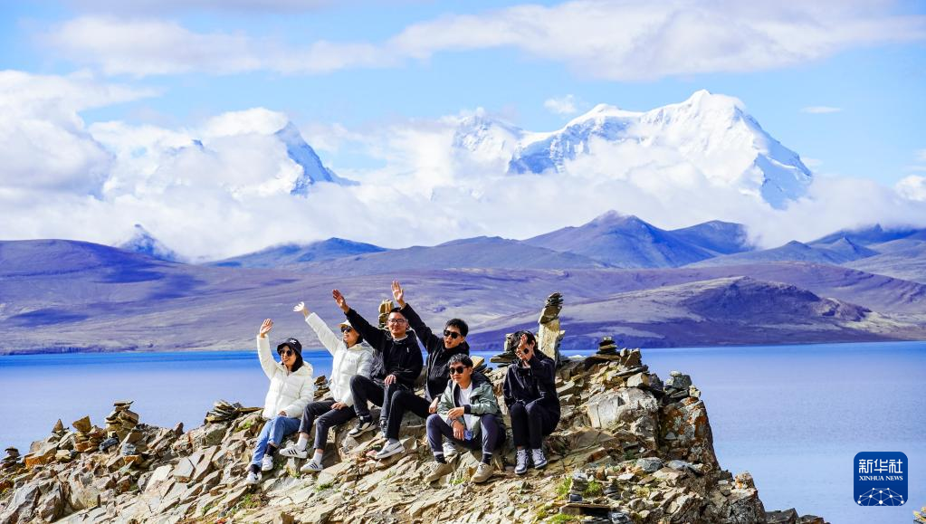 7月4日,游客在普莫雍错湖边拍照留念。新华社记者 陈尚才 摄