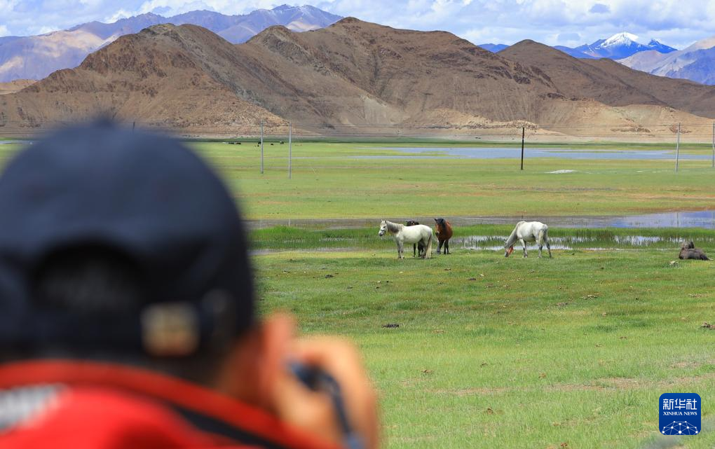 游客拍摄班公湖畔的骏马(7月28日摄)。新华社记者 关明辉 摄