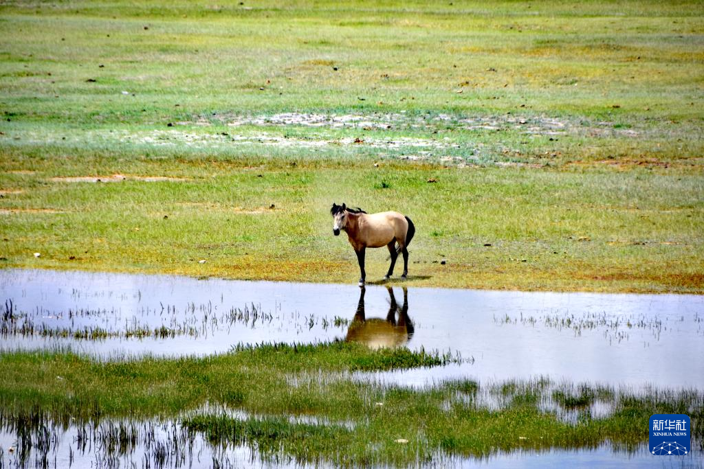 班公湖畔的骏马(7月28日摄)。新华社记者 刘文博 摄