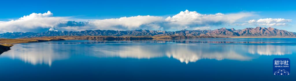 纳木那尼雪山倒映在玛旁雍错湖面上(无人机照片,9月13日摄)。新华社记者 姜帆 摄