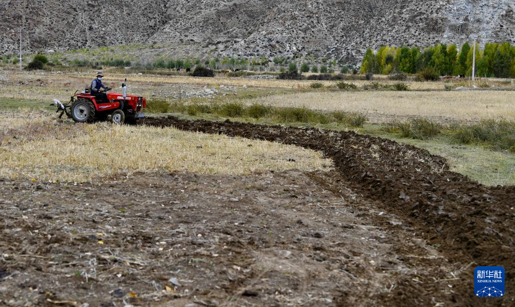 西藏拉萨市达孜区德庆镇白纳村村民驾驶小型拖拉机犁地(10月11日摄)。新华社记者 张汝锋 摄