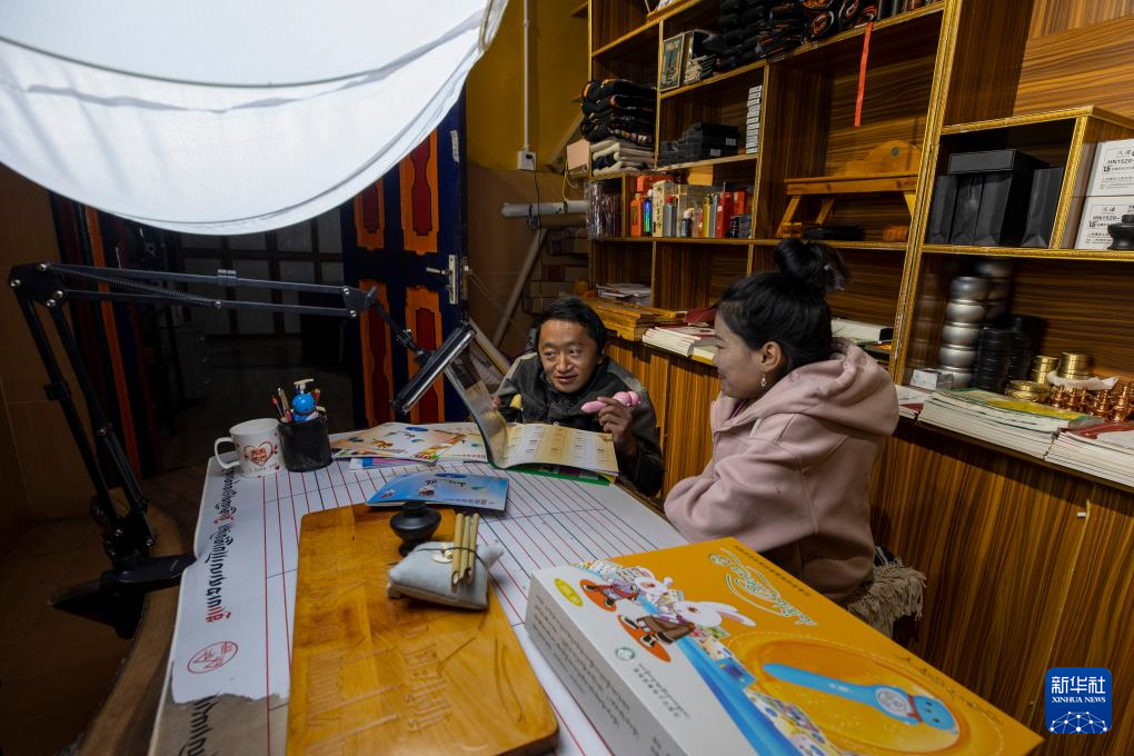 西藏拓岗文化传播有限公司主播次旦贡嘎(右)与直播助理扎西旺堆在合作直播销售藏语学习文具(11月10日摄)。新华社记者 姜帆 摄