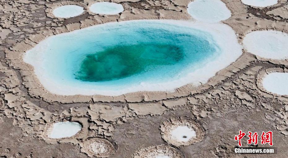 尕斯库勒湖简称尕斯湖,是固液相并存的特大型石盐盐湖矿床,位于柴达木盆地西部,东西两端分别是切克里克和阿拉尔草地,南面是昆仑西支祁曼塔格山,北面是阿尔金余脉扎哈提山。图为尕斯“蓝洞”盐泉。义西桑 摄