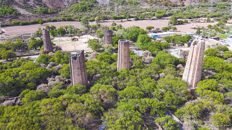这些堡垒通体呈土黄色、棕褐色,主要由片石、木头垒砌而成,内部嵌有木梁,既起到了支撑作用,又能供人攀爬至堡顶。堡垒墙厚2米,从基部到顶部逐步缩小,中间空洞,没有顶盖,周身有对称的孔洞,内部呈八角状,外观则棱角分明,呈现出十二面十二棱的棱柱状,造型设计巧妙牢固且气势恢宏,彰显了千年以前青藏高原上高超的建筑技艺。