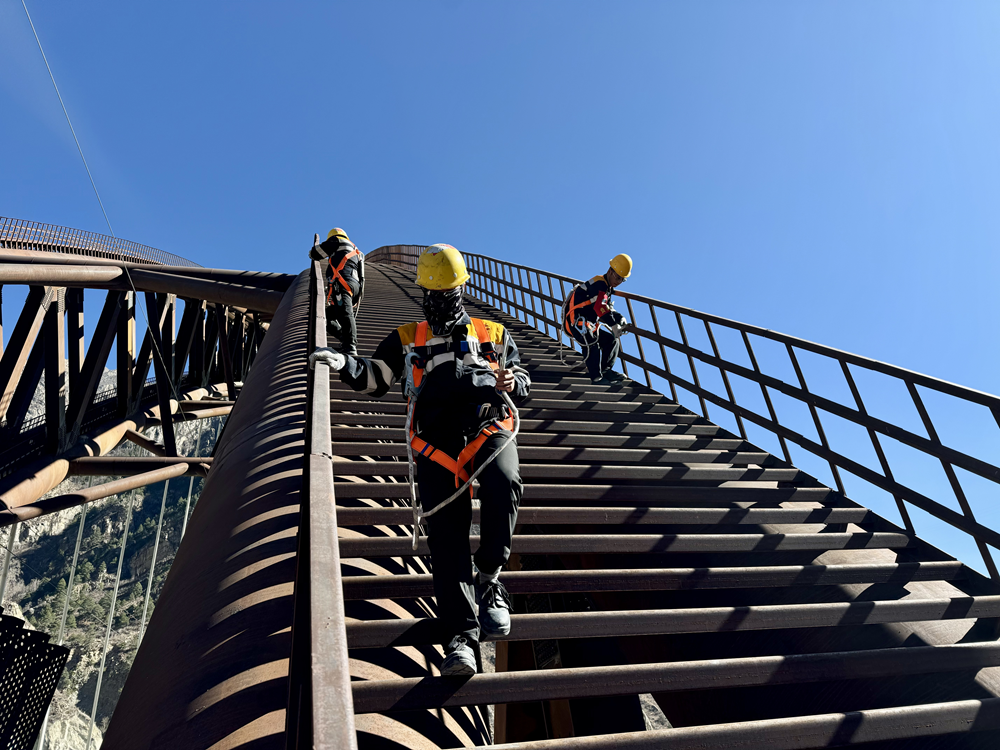 一上桥,强劲的风扑面而来。大伙儿绑好安全带后,穿过检查通道,兵分两路踏着10厘米宽的桥梁检查梯,沿两侧走上桥拱检查。
