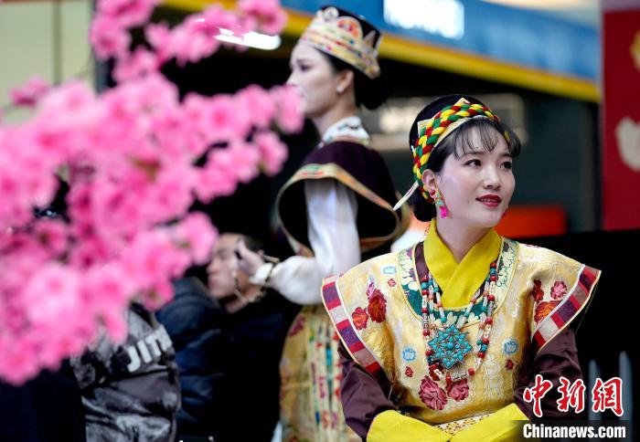 图为西藏林芝第二十二届桃花旅游文化节推介会(拉萨站)现场,身着藏装的工作人员。李林 摄