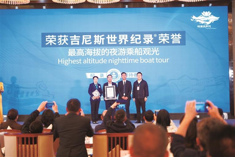 《情满拉萨河》启幕现场,中国首位吉尼斯世界纪录认证官吴晓红受邀登台,正式宣布该项目“最高海拔的夜游乘船观光”挑战成功,并现场颁发认证证书。9月28日,认证官全程参与测绘,从夜游路线设计、安全保障到文化呈现,均符合吉尼斯世界纪录认证的严苛标准。 此次认证不仅填补了世界高海拔地区夜间水上观光类项目的空白,更印证了中国在高原旅游领域的产品设计、施工建造、生产运营、创作能力达到世界领先水平。该荣誉纪录的诞生,为同类项目的国际认证与品质提升提供了重要范本,标志着拉萨文旅发展迈入国际化新阶段。