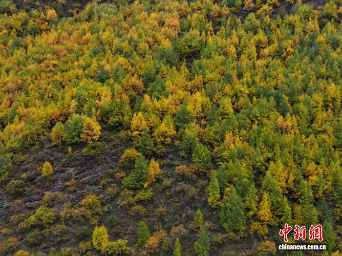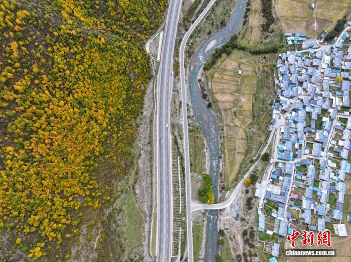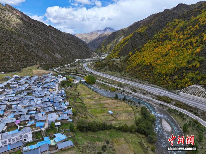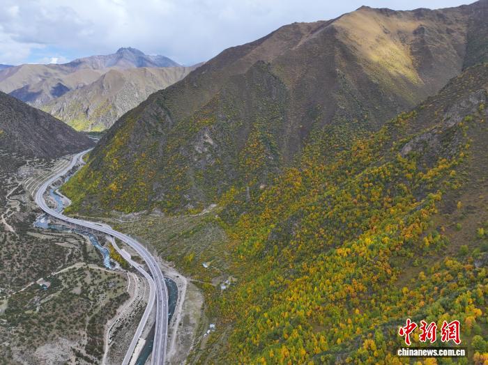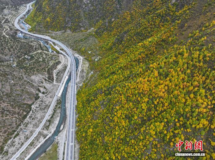 10月1日,西藏自治区林芝工布江达县秋色渐浓,拉萨至林芝的高等级公路沿线成“移动画廊”。中新社记者 贡嘎来松 摄